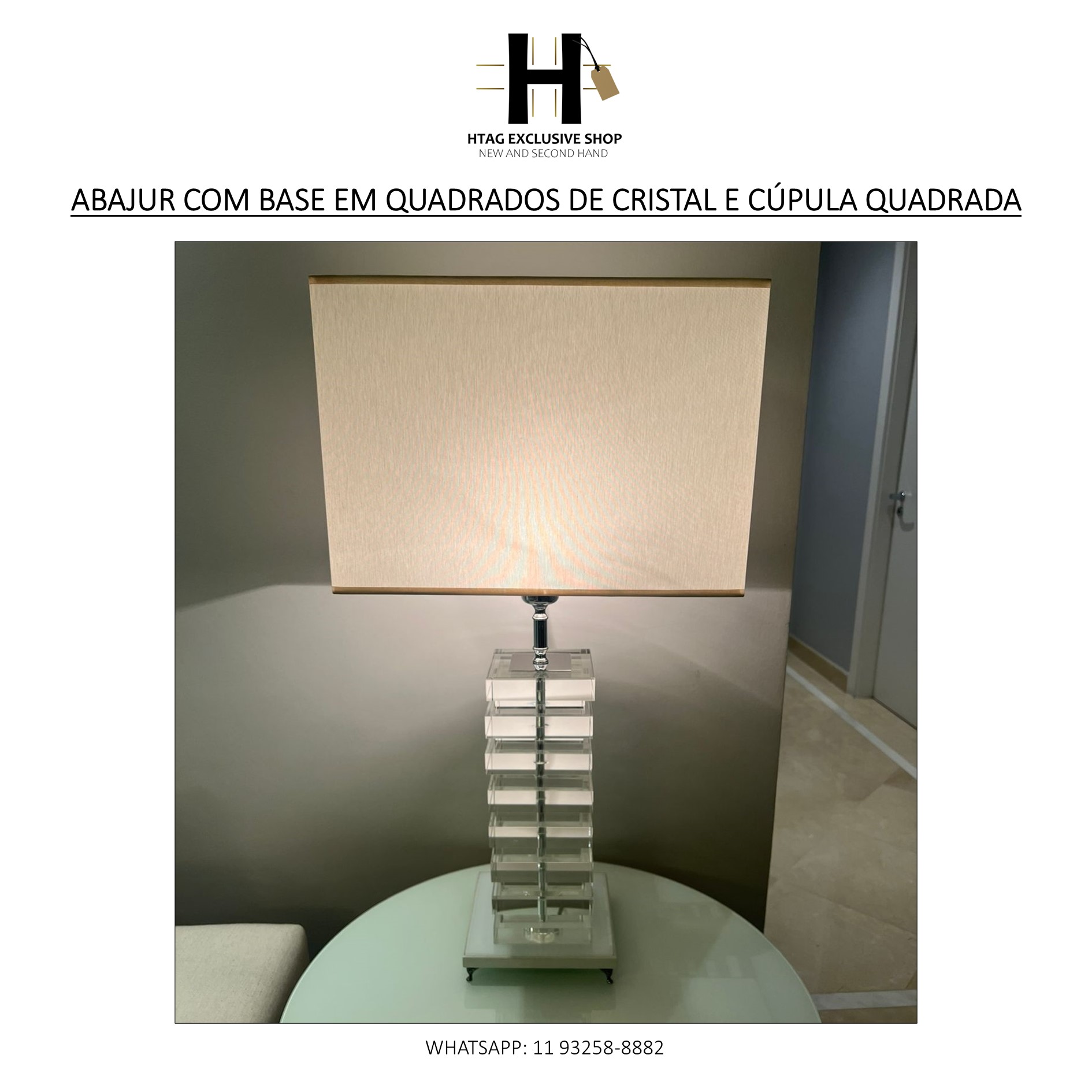 ABAJUR COM BASE EM QUADRADOS DE CRISTAL E CÚPULA QUADRADA