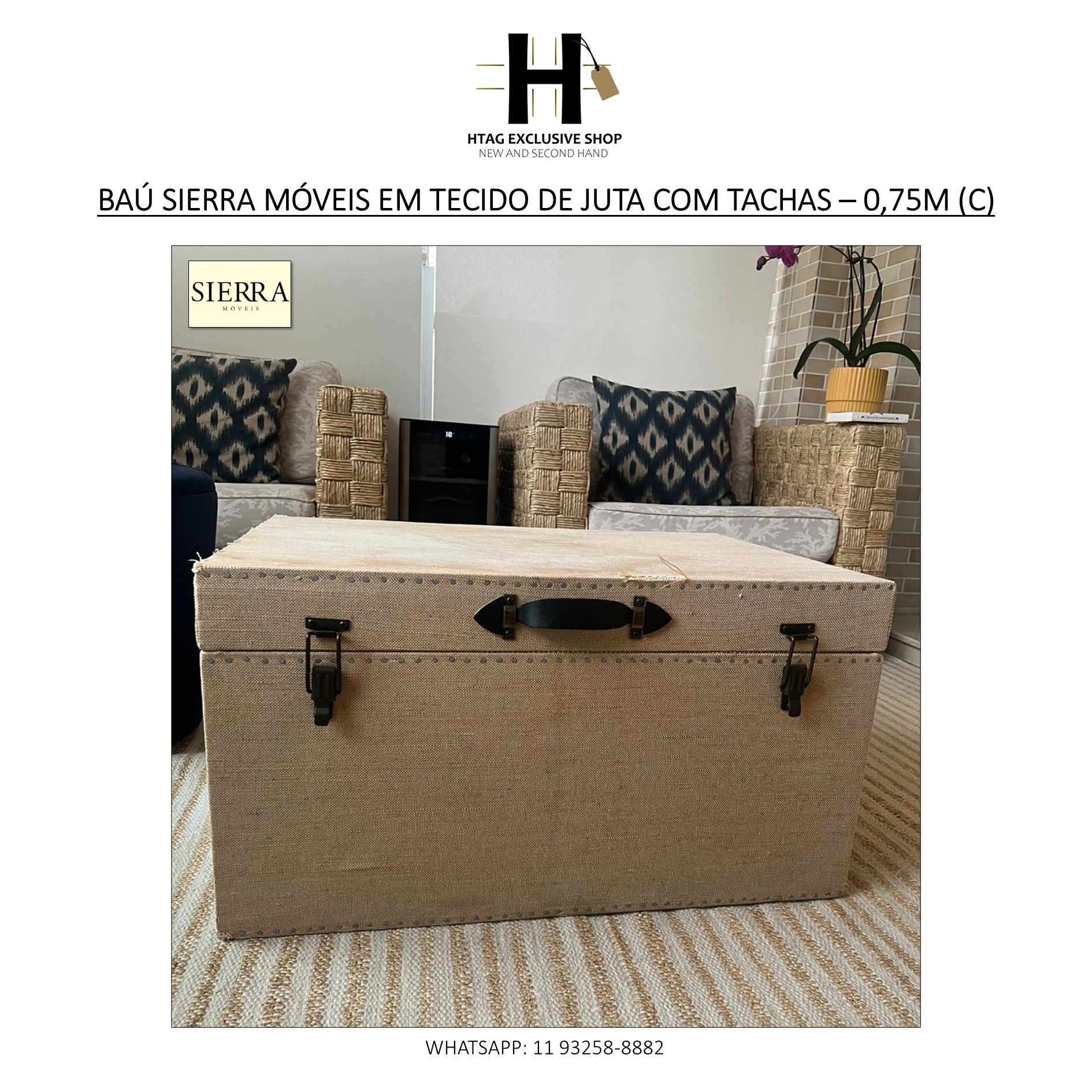 Baú Sierra Móveis em madeira forrada com juta fixada com tachas. Metais envelhecidos e alça em couro preto.