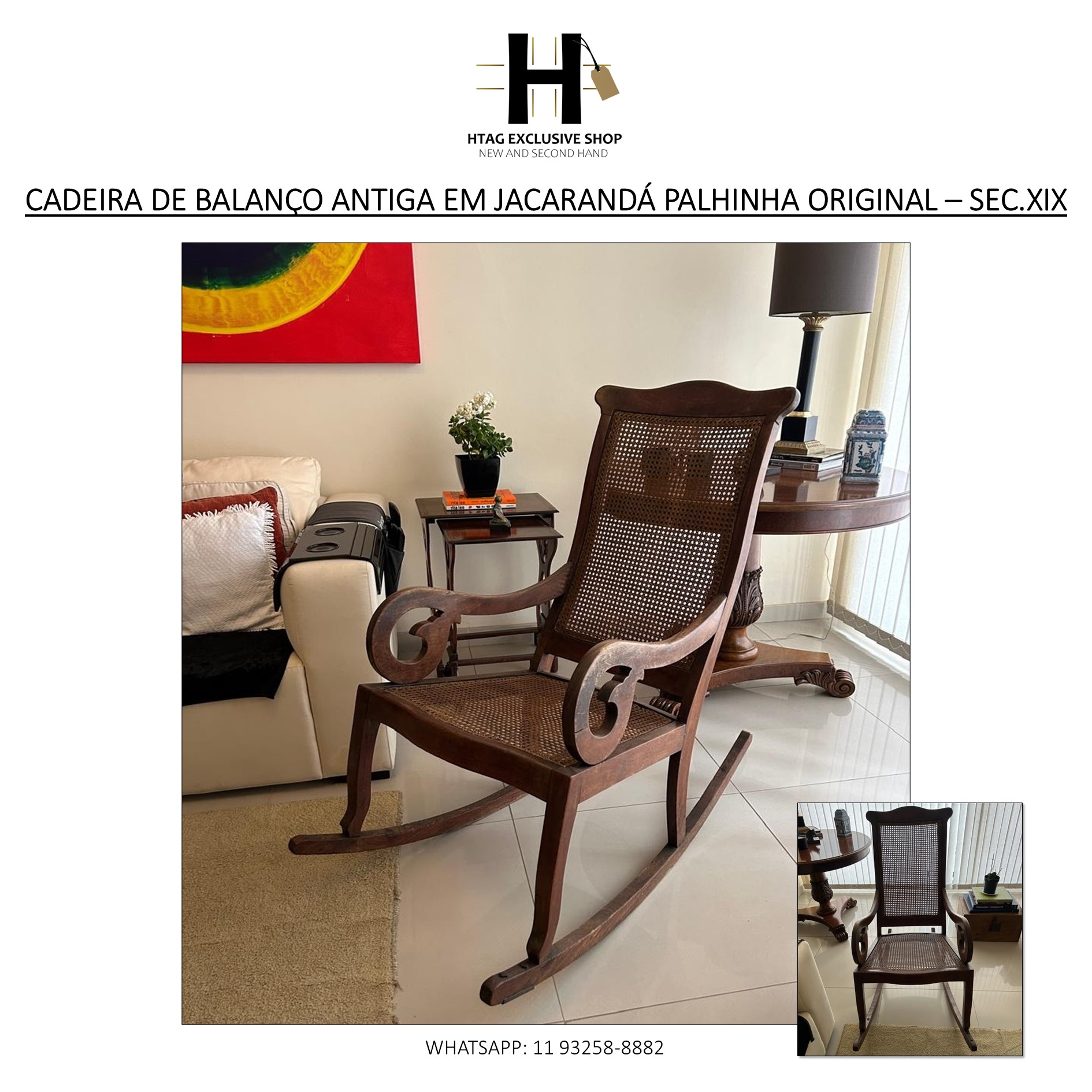 CADEIRA DE BALANÇO ANTIGA EM JACARANDÁ COM PALHINHA ORIGINAL – SÉC.XIX