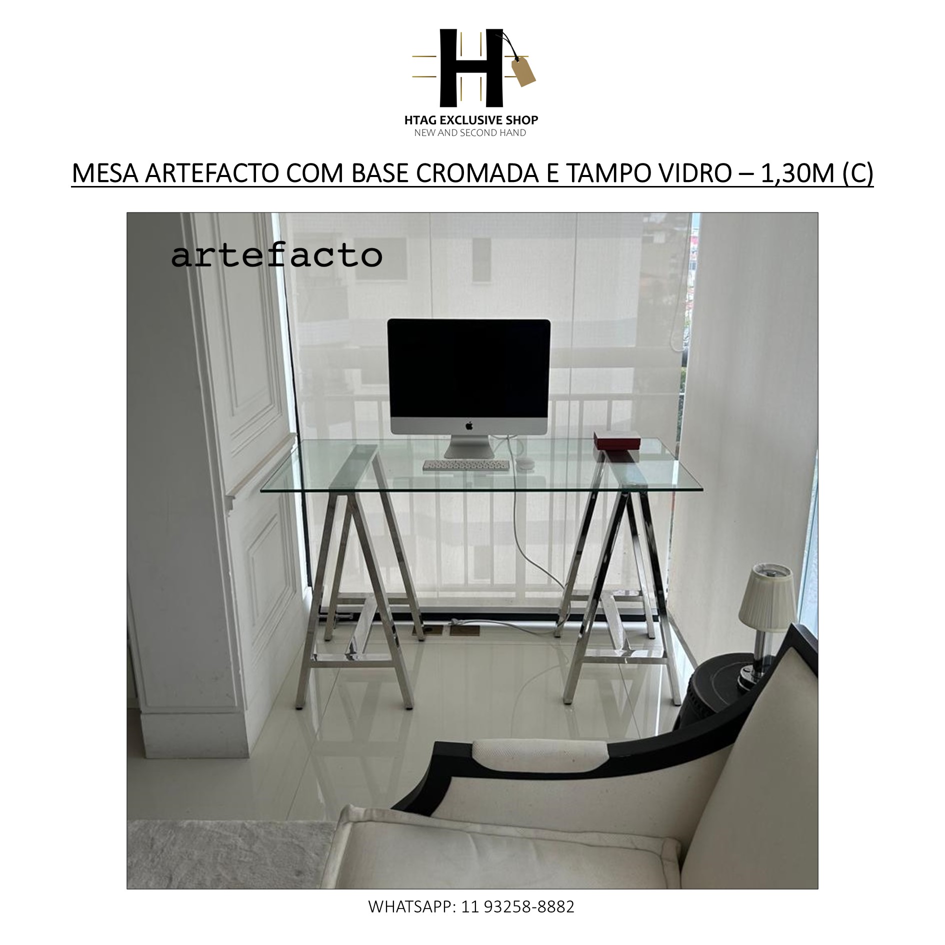 MESA ARTEFACTO COM BASE CAVALETE CROMADA E TAMPO VIDRO – 1,30M (C)