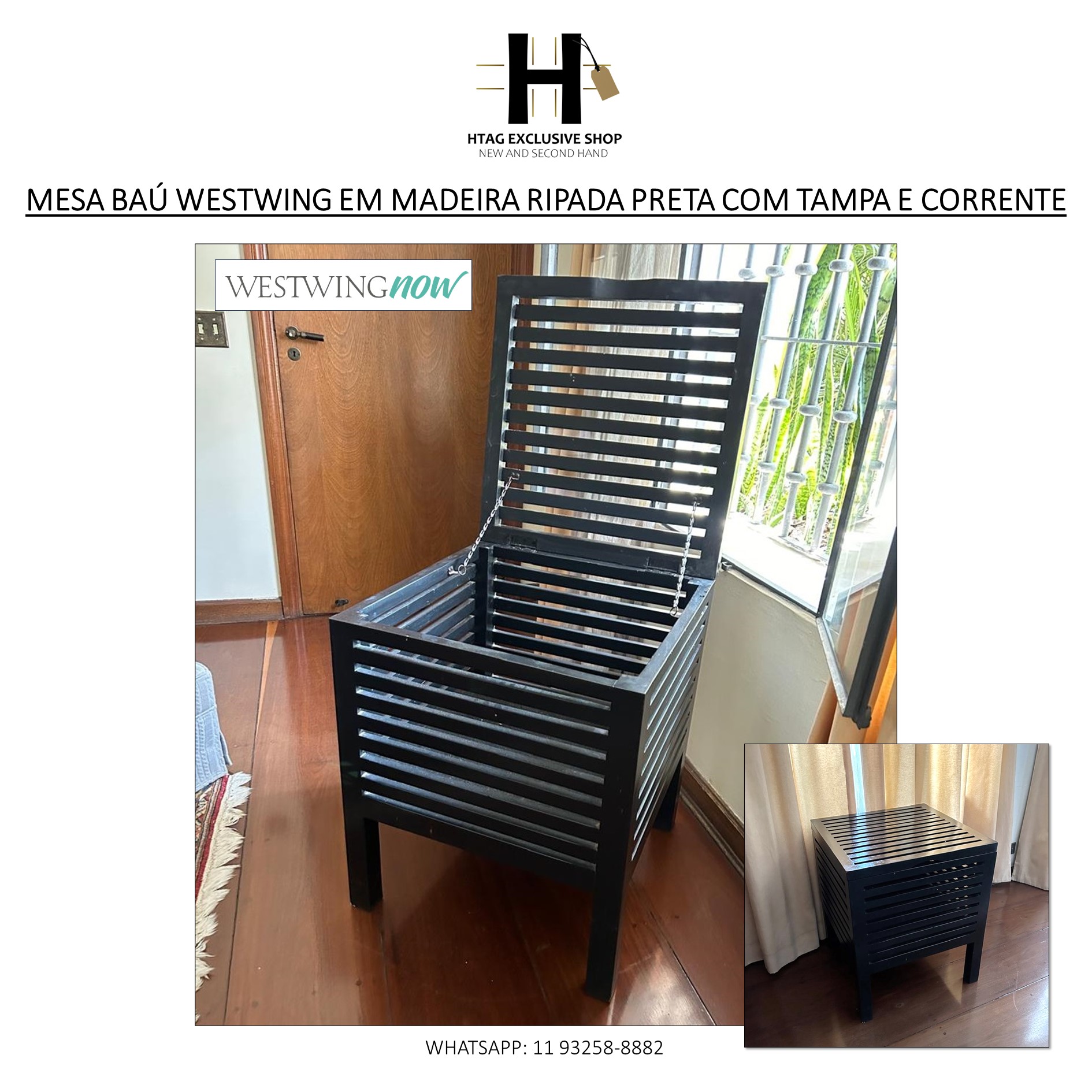 MESA BAÚ WESTWING EM MADEIRA RIPADA PRETA COM TAMPA E CORRENTE