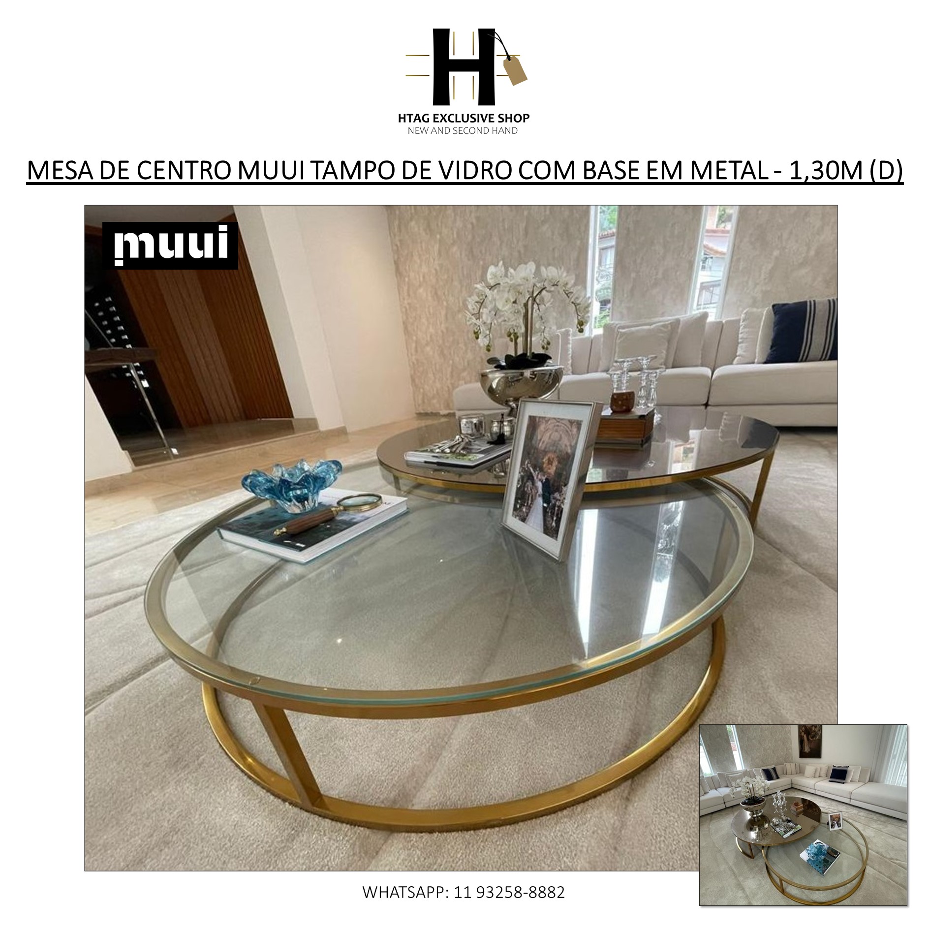 MESA DE CENTRO MUUI TAMPO DE VIDRO COM BASE EM METAL ENVELHECIDO - 1,30M (D)