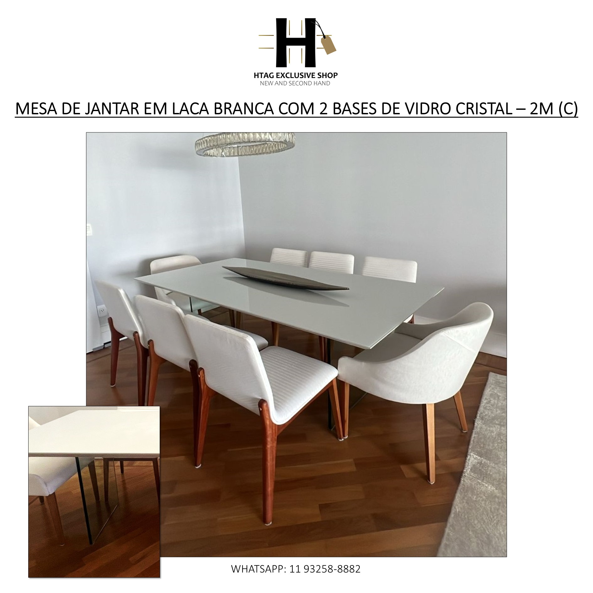 MESA DE JANTAR EM LACA BRANCA COM 2 BASES DE VIDRO CRISTAL – 2M (C)