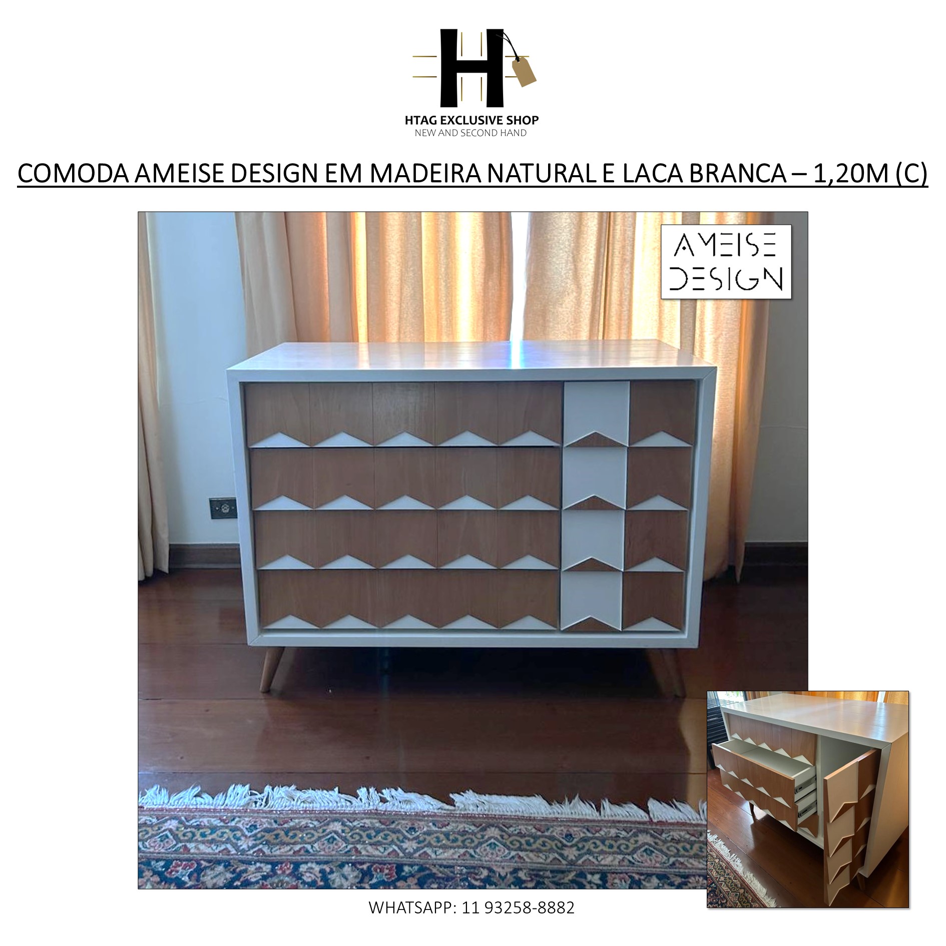 MÓVEL GAVETEIRO AMEISE DESIGN EM MADEIRA NATURAL E LACA BRANCA – 1,20M (L)