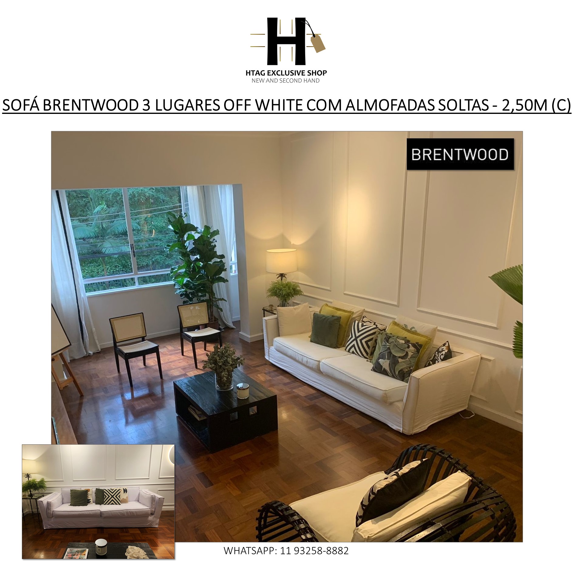 SOFÁ BRENTWOOD “KATE” 3 LUGARES TECIDO OFF WHITE COM ALMOFADAS SOLTAS - 2,50M (C)